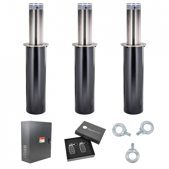 Komplett paket med tre hydrauliska pollare och en elcentral för att styra pollarens funktion och belysning. Medföljer två exklusiva fjärrkontroller som gör att man enkelt kan reglera pollarna på distans med en räckvidd upp till 200 meter beroende på omgivning och eventuell extern fasadantenn.